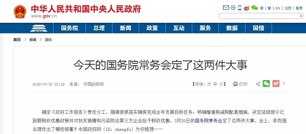 確定《政府工作報(bào)告》責(zé)任分工,強(qiáng)調(diào)狠抓落實(shí)確保完成全年發(fā)展目標(biāo)任務(wù);明確增值稅減稅配套措施,決定延續(xù)部分已到期稅收優(yōu)惠政策并對(duì)扶貧捐贈(zèng)和污染防治第三方企業(yè)給予稅收優(yōu)惠。3月20日的國(guó)務(wù)院常務(wù)會(huì)定了這兩件大事。會(huì)上,李克強(qiáng)總理作出了哪些部署?中國(guó)政府網(wǎng)(ID:zhengfu)為你梳理──
